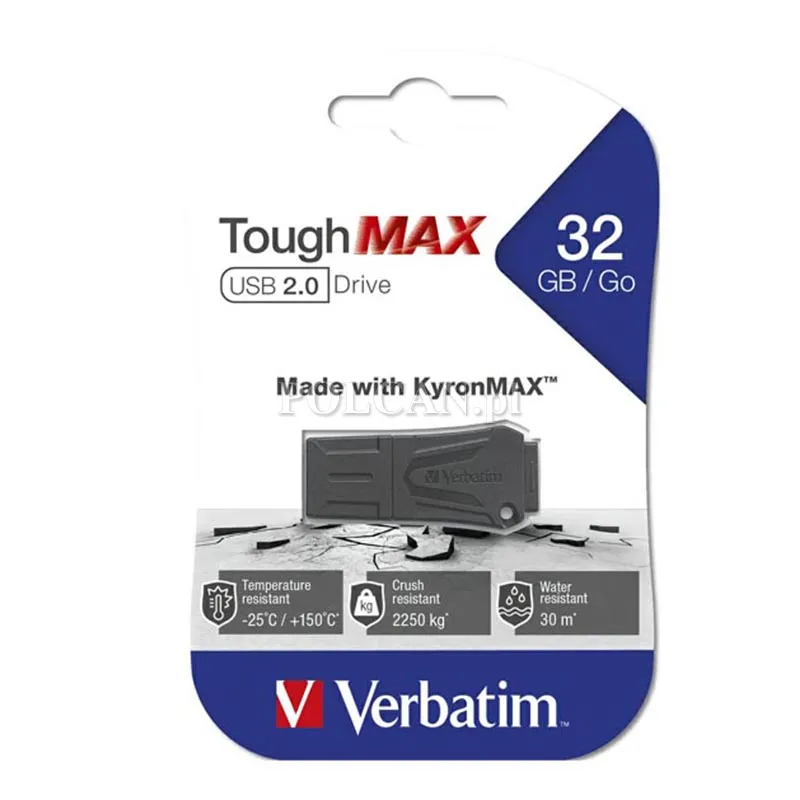 Dysk USB 2.0 ToughMAX firmy Verbatim został wykonany z komponentów KyronMAX™ — stosowanego zamiast metalu tworzywa termoplastycznego, które jest w stanie wytrzymać skrajnie nieprzyjazne warunki i jest wykorzystywane w najbardziej wymagających zastosowaniach: od rowerów górskich po samoloty myśliwskie. Komponenty KyronMAX™ są niezwykle lekkie i wytrzymałe, co sprawia, że idealnie nadają się na obudowy pamięci USB, które zniosą praktycznie wszystko i ochronią dane przed fizycznym zniszczeniem.