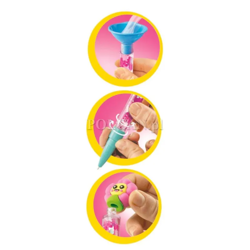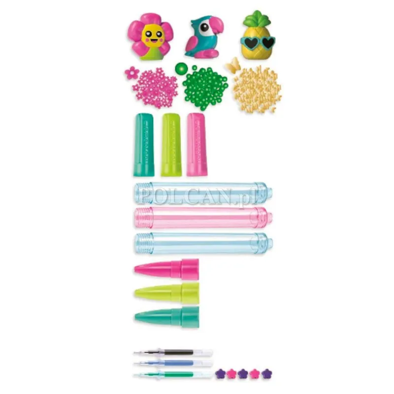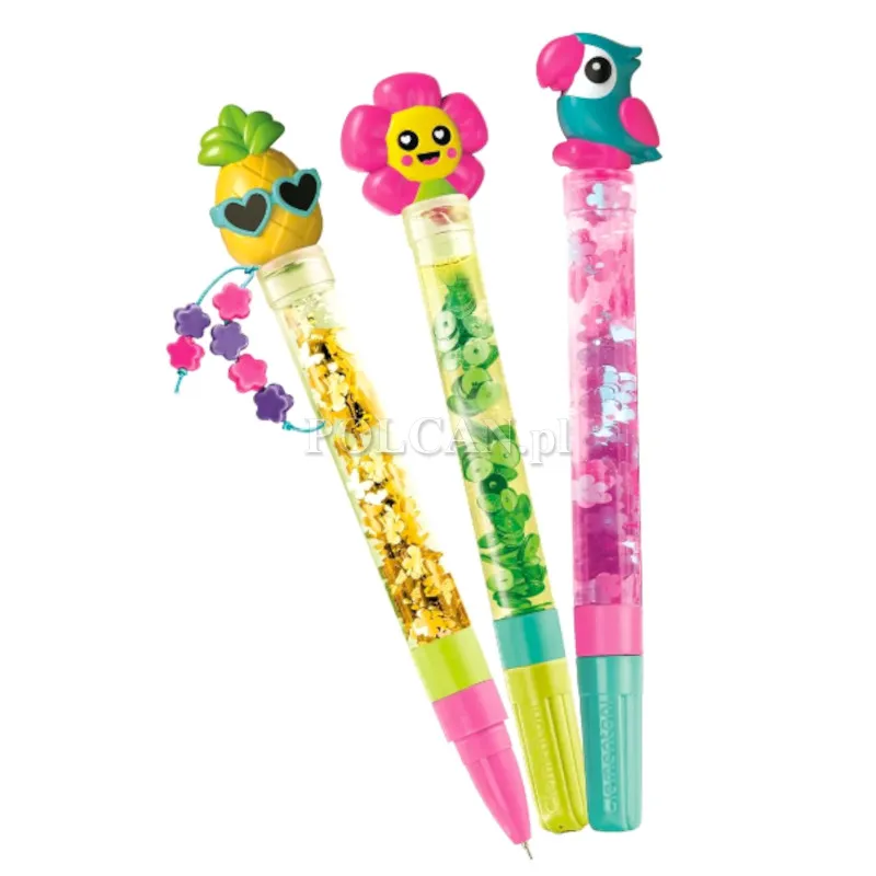 | Zawartość opakowania: | 3 korpusy długopisów, Ozdoby w kształcie ananasa, kwiatu i papugi, Różnorodne wypełnienia i dekoracje, Lejek ułatwiający wsypywanie ozdób, 3 wkłady z tuszem w 3 różnych kolorach, 3 białe zatyczki i 3 skuwki z dopasowanymi 3 kolorowymi końcówkami z plastiku, Elastyczny sznureczek, Instrukcja obsługi |
