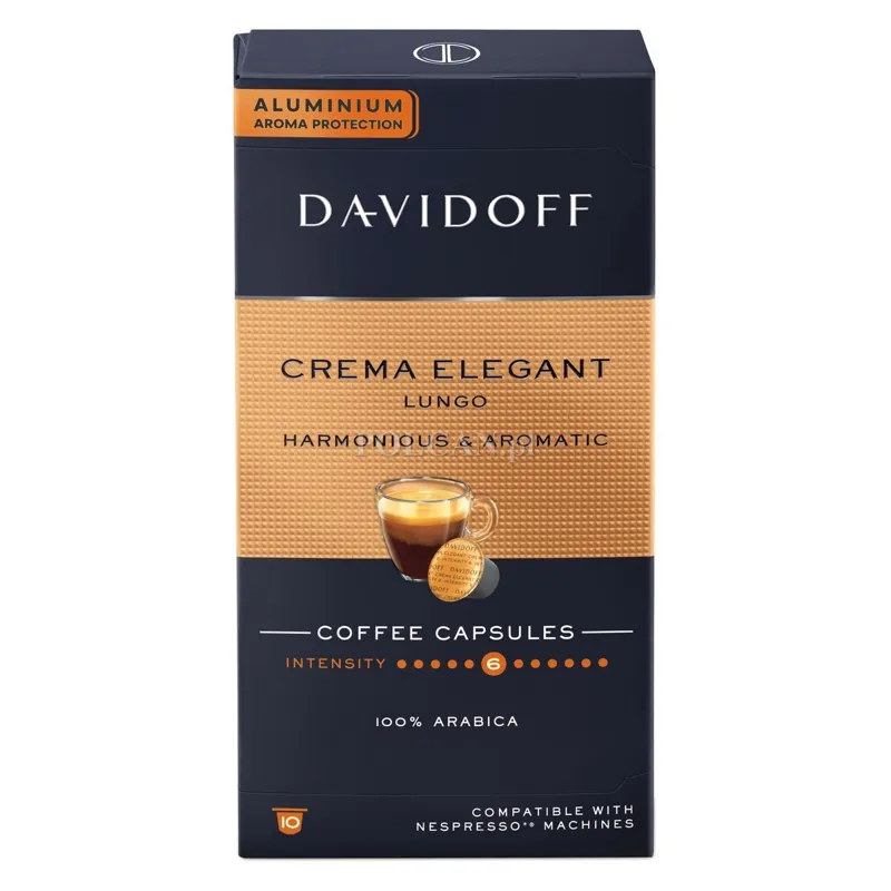 Eleganckie kapsułki Davidoff Crema zapraszają do rozkoszowania się harmonijnym Lungo z bogatą cremą na wierzchu. Ta wyjątkowa mieszanka 100% Arabiki oczarowuje podniebienie wymagających miłośników kawy swoim niezwykle aromatycznym i zaokrąglonym smakiem. Charakterystyczna, ale o łagodnej treściwości, Davidoff Crema Elegant zapewnia codzienną dawkę przyjemności z kawy.