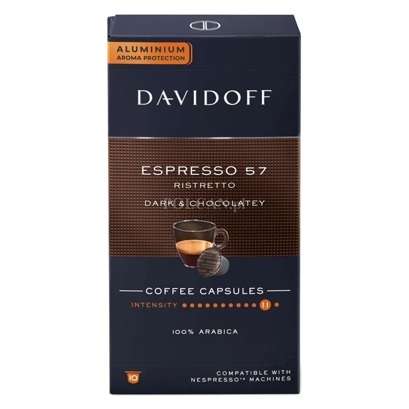 Tajemnica kapsułek Davidoff Espresso 57 tkwi w doskonałej równowadze między czasem palenia a temperaturą, która nadaje mu wyjątkowe ciemne palenie i charakterystyczne czekoladowe nuty. Davidoff Espresso 57 pobudza zmysły bogactwem aromatów i intensywnym smakiem, który idealnie nadaje się do przygotowania kawy Ristretto.