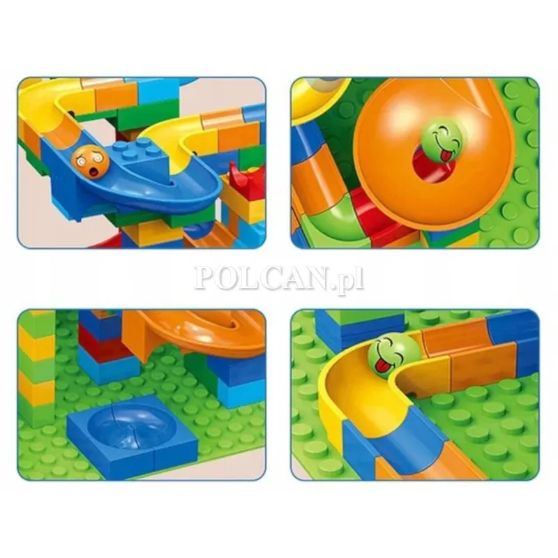 - Kolorowe tory kulkowe z zakrętami, zjeżdżalniami i ruchomymi częściami.