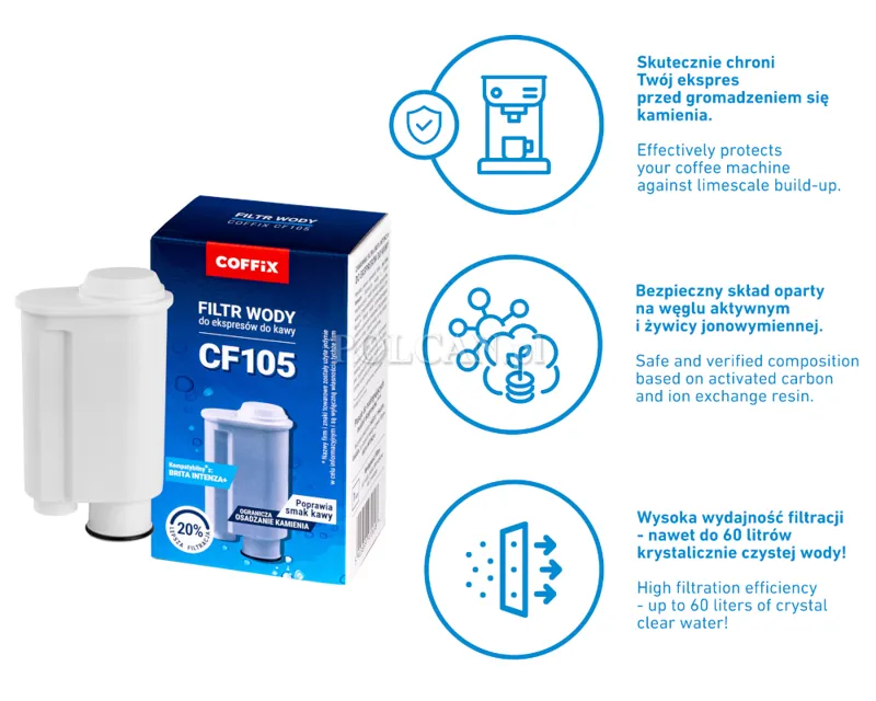 Zastosowanie filtra ułatwia otrzymanie idealnej w smaku, oczyszczonej wody, która jest pozbawiona osadów wapiennych, aby chronić urządzenie przed zakamienieniem.