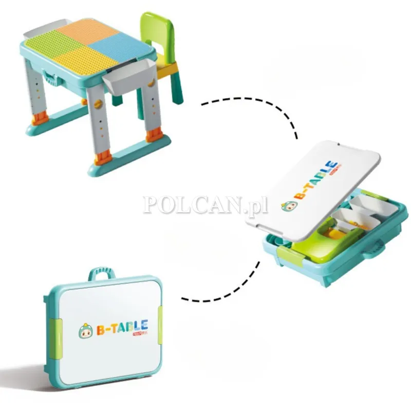 Praktyczne centrum zabawy, nauki i przechowywania! Kolorowy zestaw 3w1 z regulowaną wysokością to idealne rozwiązanie dla każdego malucha. Stolik pełni funkcję stołu do klocków, biurka oraz pojemnika na akcesoria. Dzięki możliwości złożenia w formę walizki, świetnie sprawdzi się zarówno w domu, jak i w podróży.