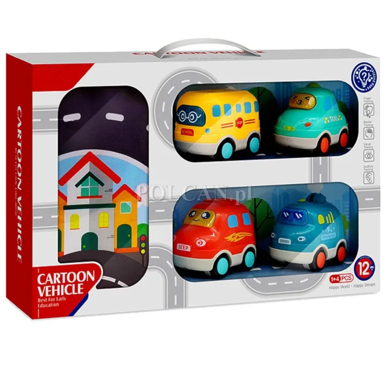 Zestaw 4 pojazdów z kolorową mapą – idealny dla dzieci od 12 miesiąca życia
