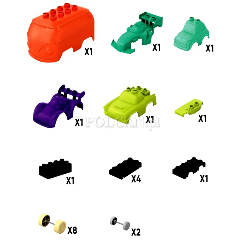 | Zawartość opakowania: | 5 pojazdów do złożenia (różne modele i kolory), Elementy do dodatkowego łączenia i dekoracji |