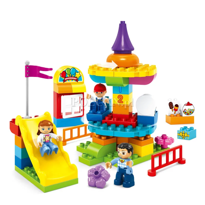 | Zawartość opakowania: | 68 elementów, 3 figurki dzieci/postaci, Karuzela do samodzielnego złożenia, Zjeżdżalnia, Budka tematyczna (np. z lodami, biletami), Dodatki: barierki, kwiatki, dekoracje |