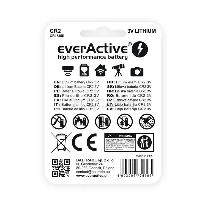 Everactive Bateria litowa CR123 Baterie cylindryczne everActive CR2 o pojemności 850mAh to niezawodne źródło zasilania dla urządzeń wymagających stabilnej pracy, niewielkich rozmiarów ogniwa oraz długiej żywotności. Dzięki technologii litowej zapewniają stałe napięcie 3V, wysoką wydajność oraz bezproblemowe działanie nawet w trudnych warunkach..