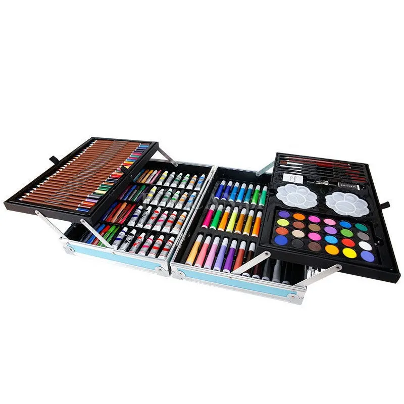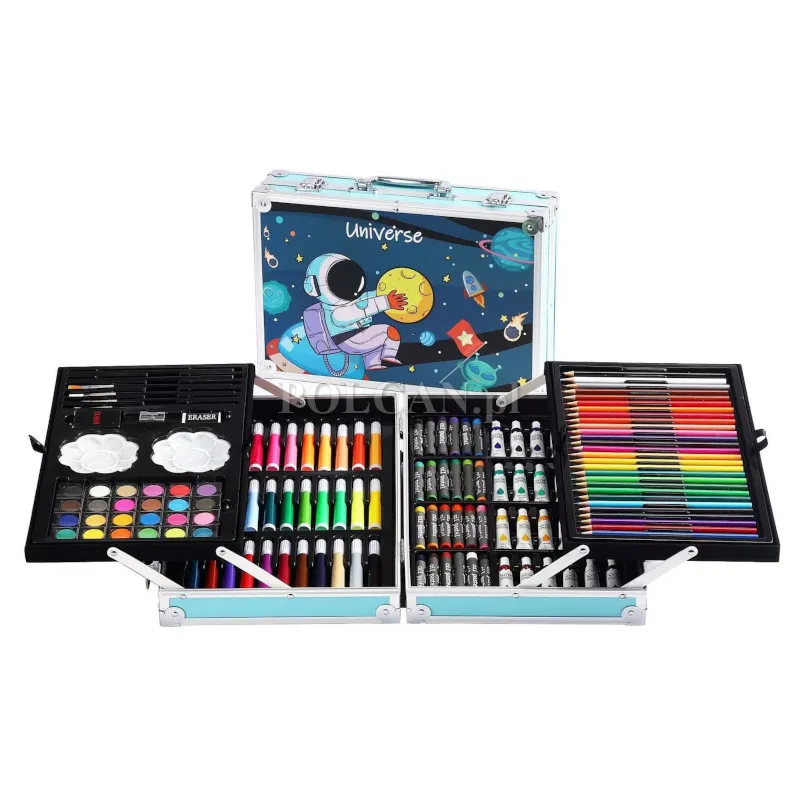| Zawartość opakowania: | Rozkładana walizka, 2 paletki na farby, 2 gumki, temperówka, 4 pędzle o różnych końcówkach, 2 ołówki, 28 kredek ołówkowych, 33 pisaki, 24 pastele olejne, 24 tubki z pastami akwarelowymi, 24 farbki |