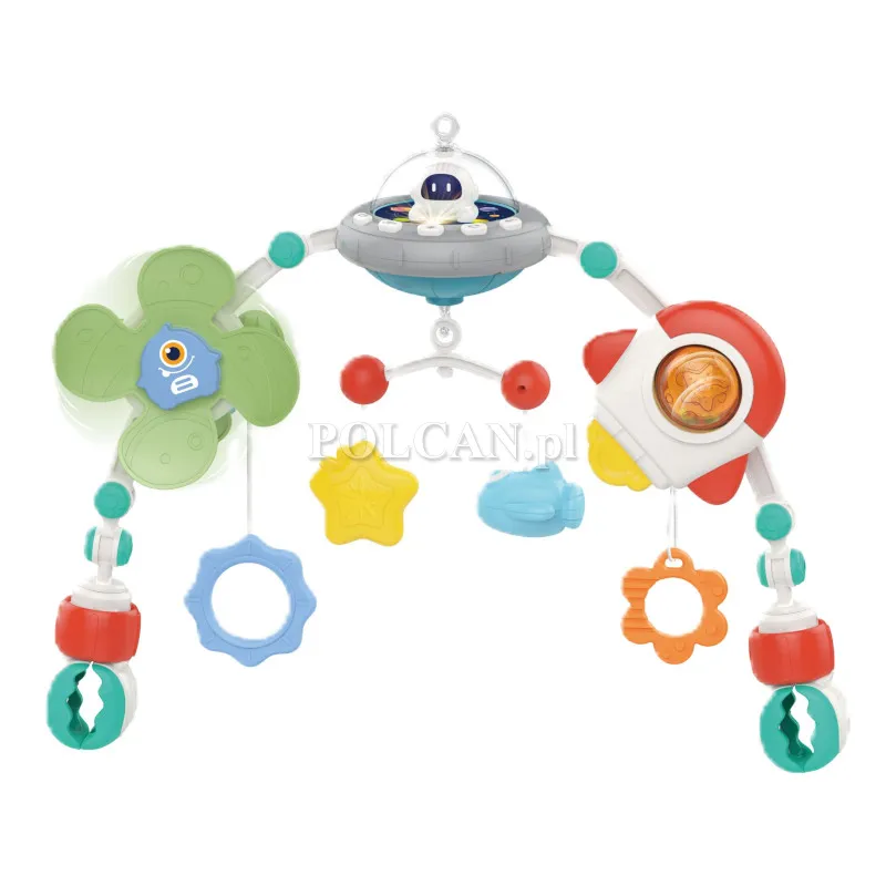 - Ruchome i sensoryczne zawieszki – rakieta, wiatraczek, gwiazdki i grzechotki stymulują zmysły i rozwijają zdolności motoryczne.