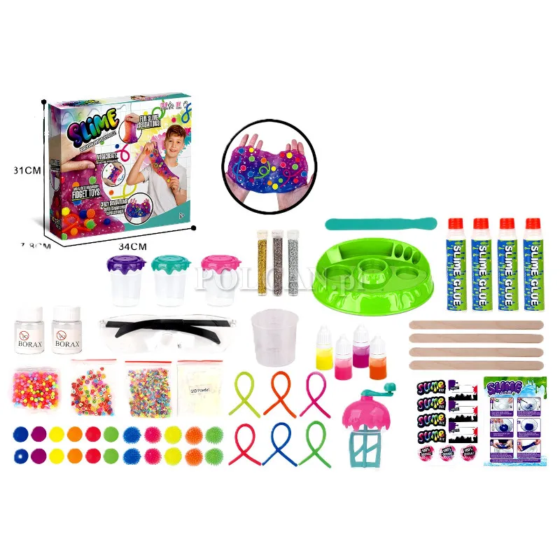 | Zawartość opakowania: | 4 × klej slime glue, 2 × boraks (aktywator), 3 × pojemniczki z pokrywkami, 1 × taca do mieszania, 1 × kubek z miarką, 1 × szpatułka, 4 × drewniane mieszadełko, 4 × barwniki (różowy, żółty, pomarańczowy, czerwony), 3 × brokat (złoty, srebrny, czarny), 1 × mikser ręczny, 6 × gumki sensoryczne, fidgety, kulki, koraliki, pył świecący, 1 × okulary ochronne, 2 × arkusze naklejek i instrukcji |