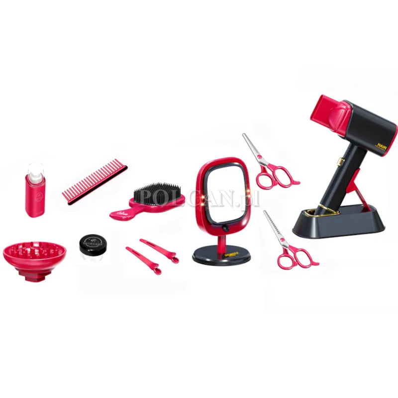 | Zawartość opakowania: | Suszarka do włosów (interaktywna), Lustro z podświetleniem LED, Grzebień, Szczotka do włosów, Butelka imitująca kosmetyk, Słoiczek z "kosmetykiem", 2× Klips do włosów, 2× Nożyczki (bezpieczna imitacja), 1× Końcówka dyfuzora do suszarki |