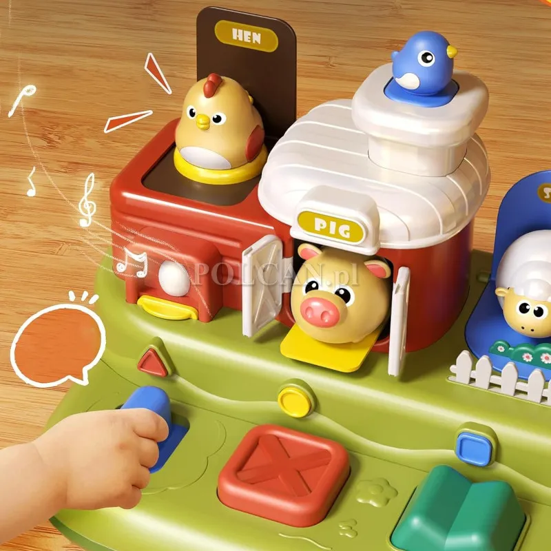 Farm Pop-Up to kolorowa, edukacyjna zabawka interaktywna dla dzieci od 12 miesiąca życia, która wprowadza malucha w świat związków przyczynowo-skutkowych poprzez zabawę. Każde działanie – naciśnięcie, przekręcenie czy przesunięcie przycisku – skutkuje wyskoczeniem figurki zwierzątka i odtworzeniem realistycznego dźwięku. Idealna do nauki dźwięków zwierząt, rozwijania pamięci oraz wspierania rozwoju motoryki.