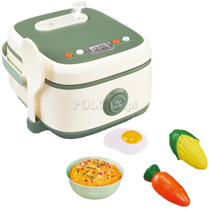 | Zawartość opakowania: | Ryżowar interaktywny z pokrywką, Miska z plastikowym „ryżem”, Warzywa do zabawy: marchewka, kukurydza, Jajko sadzone, Łyżka do nakładania |
